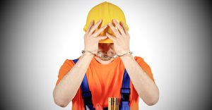 failure guilty laborer regretful criminal handcuffed hard hat blue collar portrait on white background