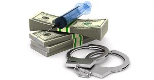 money and syringe and handcuffs on white background. Isolated 3D illustration