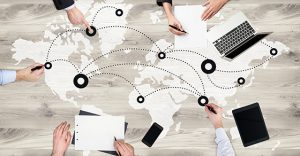 Global networking concept with businesspeople team working on wooden surface with map, network and electronic devices